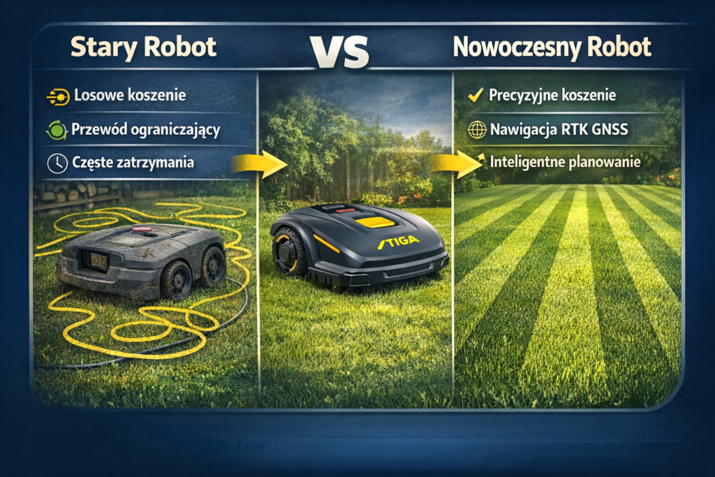Cecha Starszy robot koszący (np. STIGA Autoclip 230 S) Nowoczesny robot autonomiczny STIGA System nawigacji Przewód ograniczający Precyzyjna nawigacja satelitarna GNSS + RTK Sposób koszenia Losowy Zorganizowane koszenie w równych pasach Instalacja Wymaga instalacji przewodu w ogrodzie Instalacja w kilka minut – bez przewodów Planowanie pracy Brak mapy ogrodu Inteligentne mapowanie ogrodu Precyzja koszenia Zależna od losowych przejazdów Idealnie równe pasy koszenia Efekt na trawniku Czasem nieskoszone fragmenty Równomierny, estetyczny trawnik Nawigacja przy drzewach i budynkach Może mieć trudności z orientacją Stabilna nawigacja dzięki RTK i AGS Wykrywanie przeszkód Czujniki zderzeniowe Kamera AI rozpoznająca przeszkody Zarządzanie robotem Panel robota lub prosta aplikacja Zaawansowana aplikacja STIGA.GO Wzory koszenia Brak możliwości wzorów Pasy, szachownica, siatka Optymalizacja pracy Stały schemat pracy Inteligentne planowanie trasy